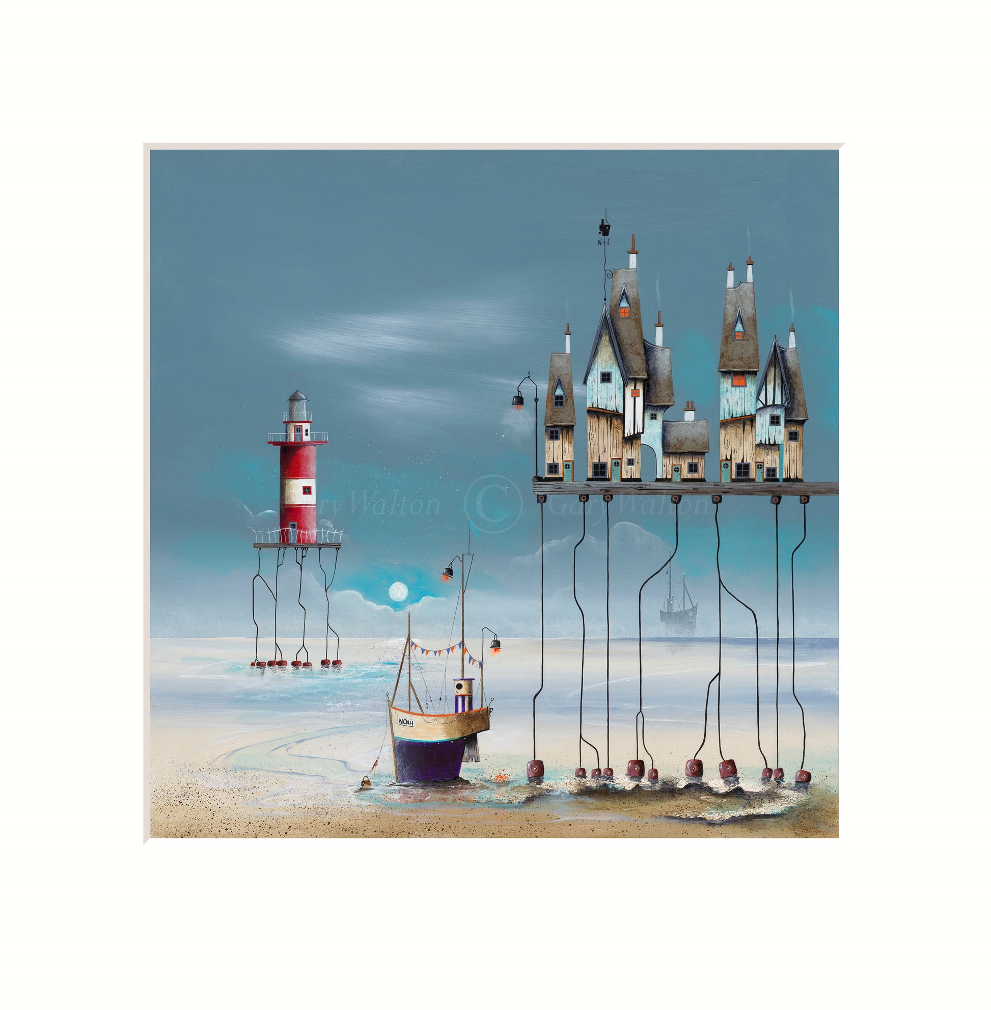 "Noah" by Gary Walton is a captivating piece that reflects his signature whimsical and surreal style. The artwork features a charming coastal scene, with a boat named "Noah" as the focal point. The boat is depicted resting peacefully in a harbour, surrounded by stilted buildings and a lighthouse in the distance. The muted tones and soft reflections in the water create a tranquil and dreamlike atmosphere, inviting viewers to immerse themselves in the serene setting.