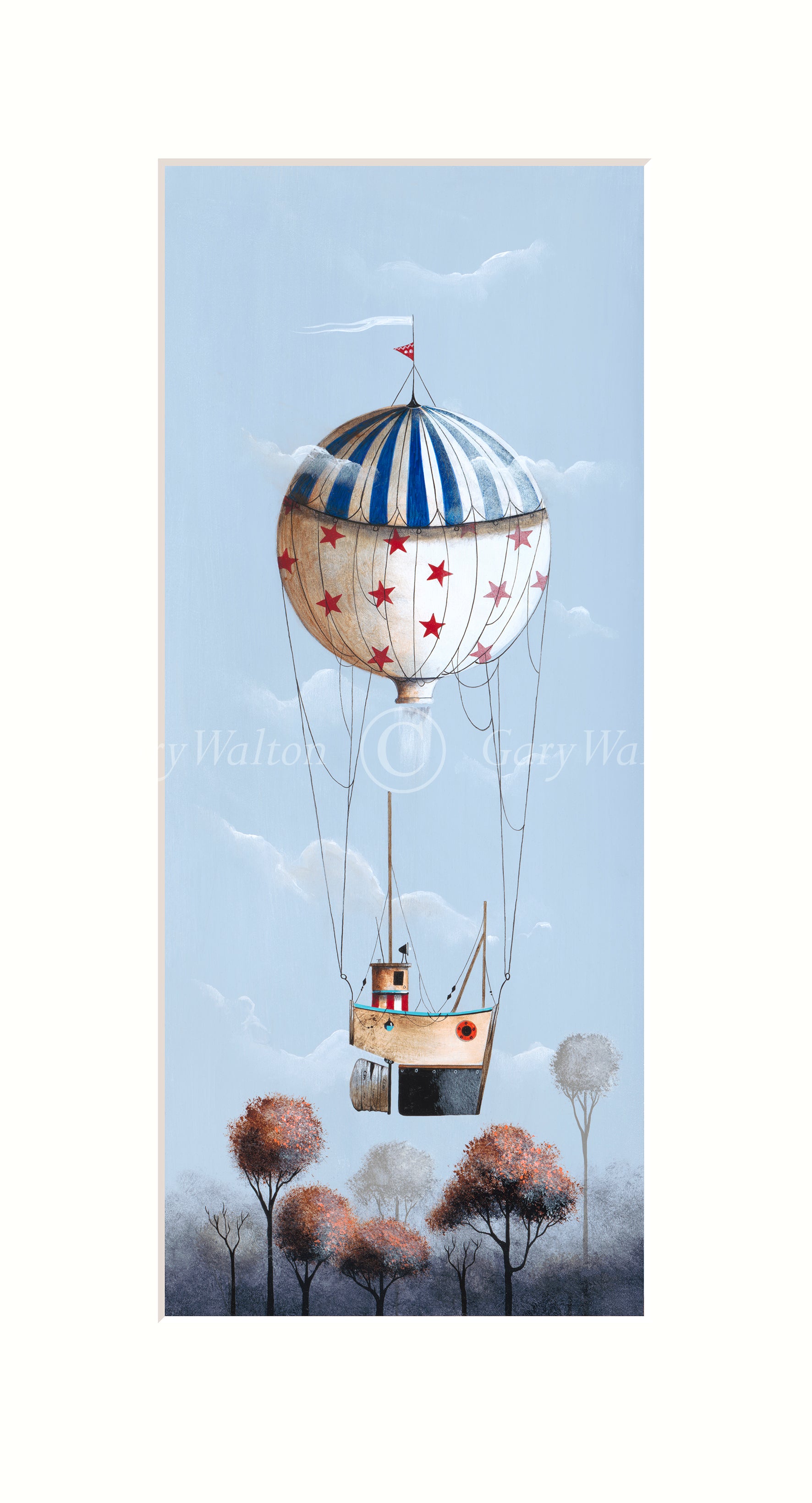 "Treetops" by Gary Walton is a captivating and whimsical piece that showcases his signature blend of fantasy and charm. The artwork features a serene scene of stilted houses nestled among treetops, creating a dreamlike atmosphere. The muted tones and intricate details invite viewers to immerse themselves in this enchanting world, blending coastal nostalgia with imaginative storytelling.