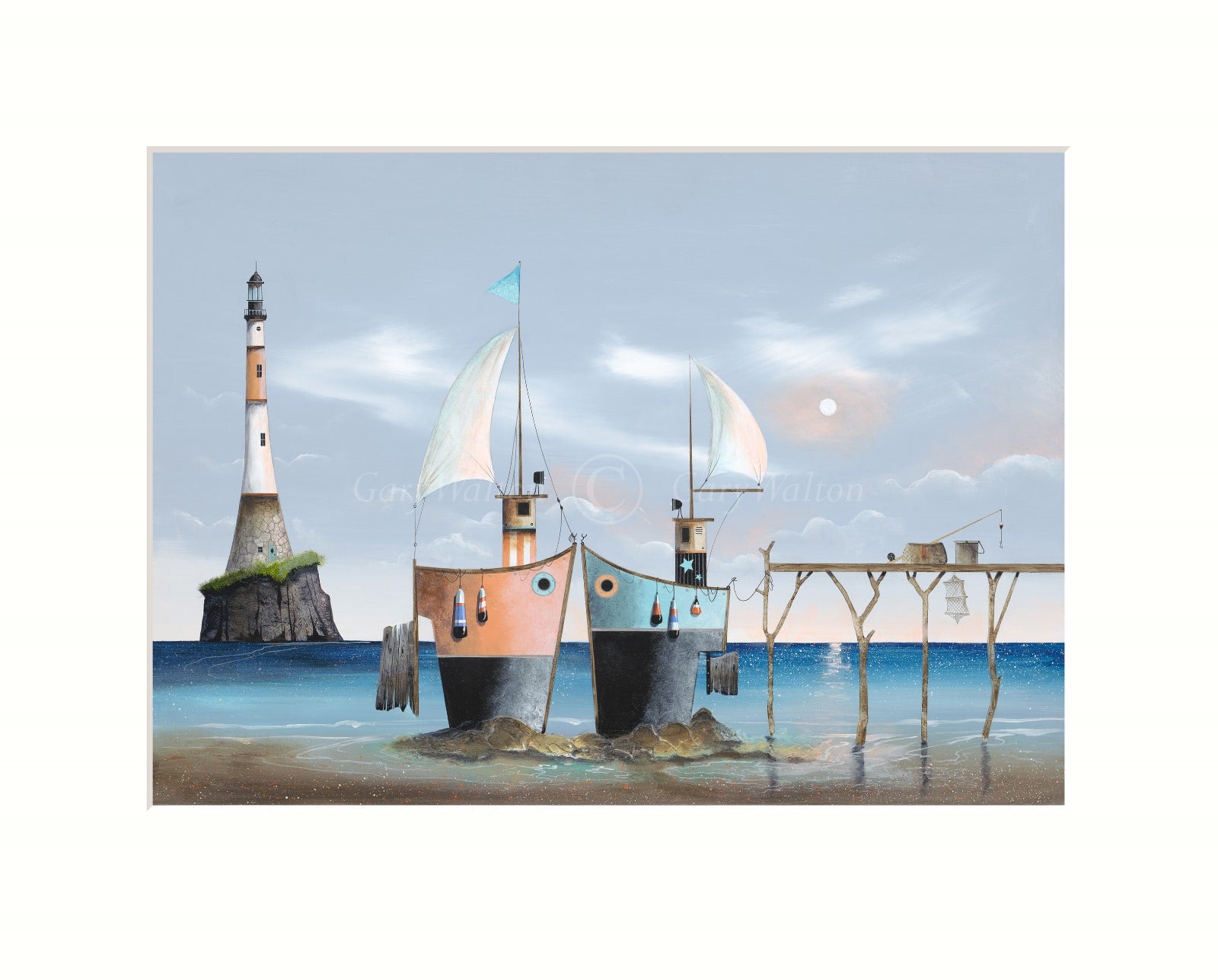 "Paisley and Piper" by Gary Walton is a delightful and whimsical piece that showcases his signature surreal style. The artwork features two charming houses, "Paisley" and "Piper," perched on stilts above the water, creating a sense of balance and harmony. The scene is infused with coastal charm, with a lighthouse in the background and boats gently resting in the harbour.